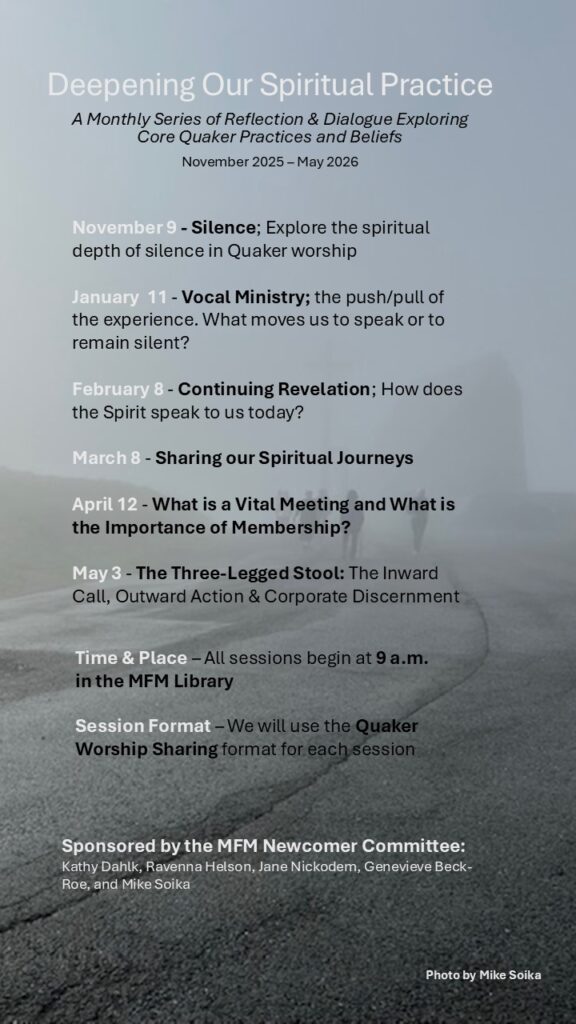 Each year the Milwaukee Friends Meeting hosts a series of workshops aimed at helping participants to gain a deeper understanding of Quakerism. These workshops are helpful to those new to meeting as well as those who are familiar with Quaker practices but who are seeking to expand their faith journey.